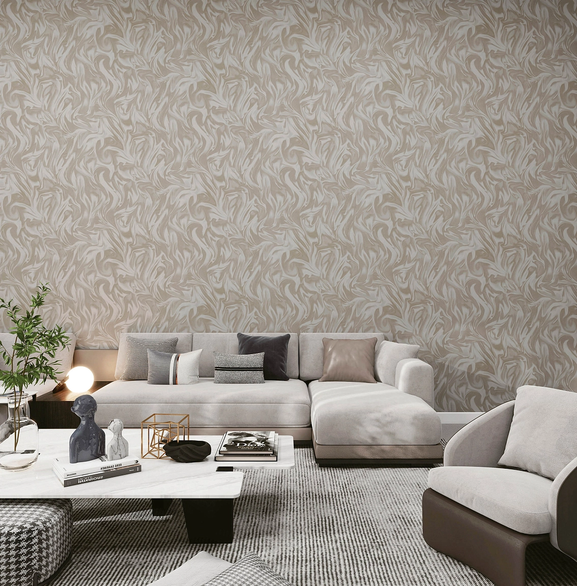 Серебряный цвет обоев придает интерьеру особую изысканность и шарм, подчеркивая стиль лофт. Жатка Alchemy создает глубокий и объемный рисунок, который придает помещению уют и индивидуальность.