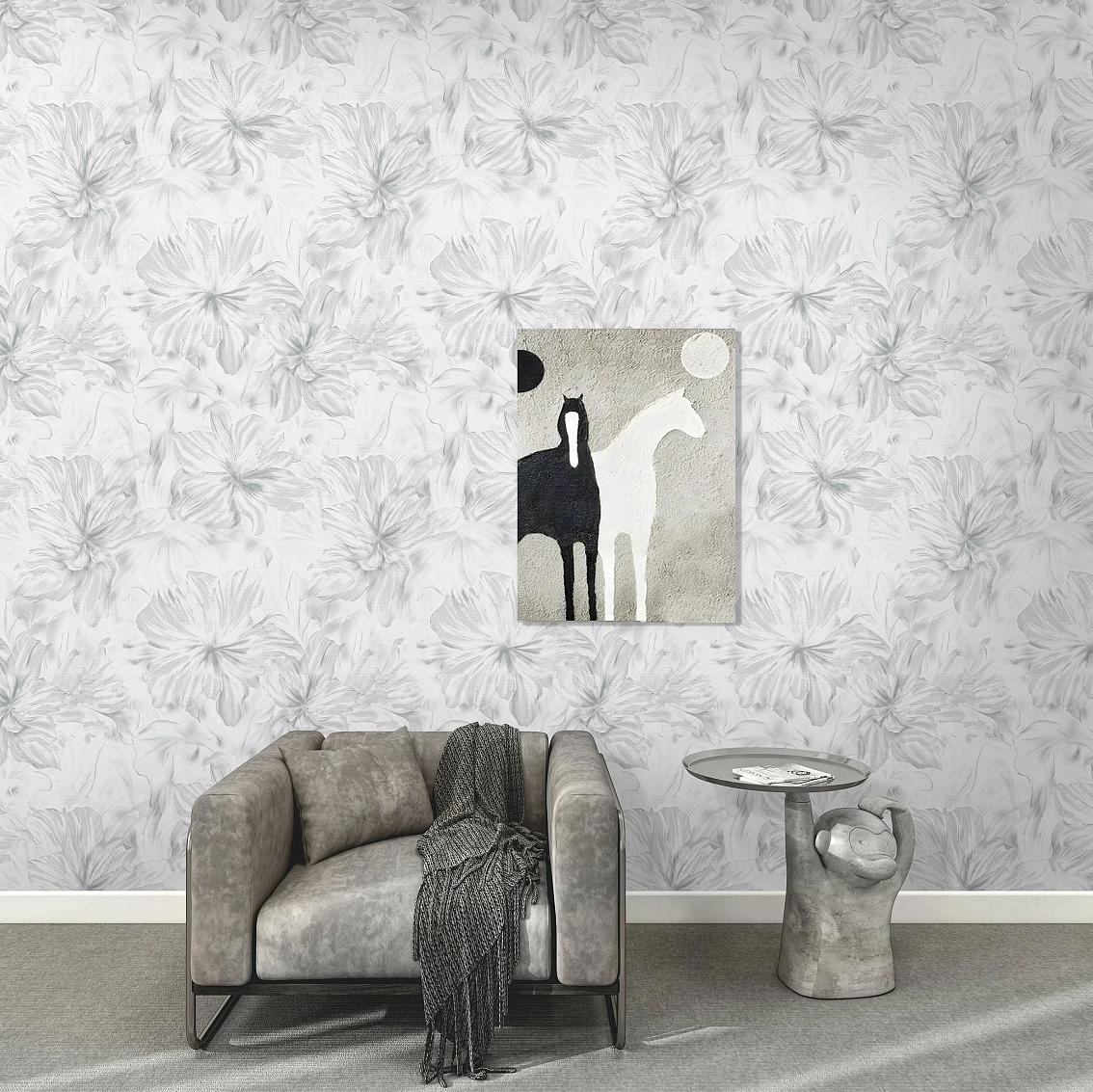 Серый цвет обоев создает спокойную и уютную атмосферу в любом интерьере, а флористический стиль добавляет нотку природной красоты. Цветы Alchemy, изображенные на обоях, придают стенам живописный и утонченный вид, делая комнату стильной и уникальной.